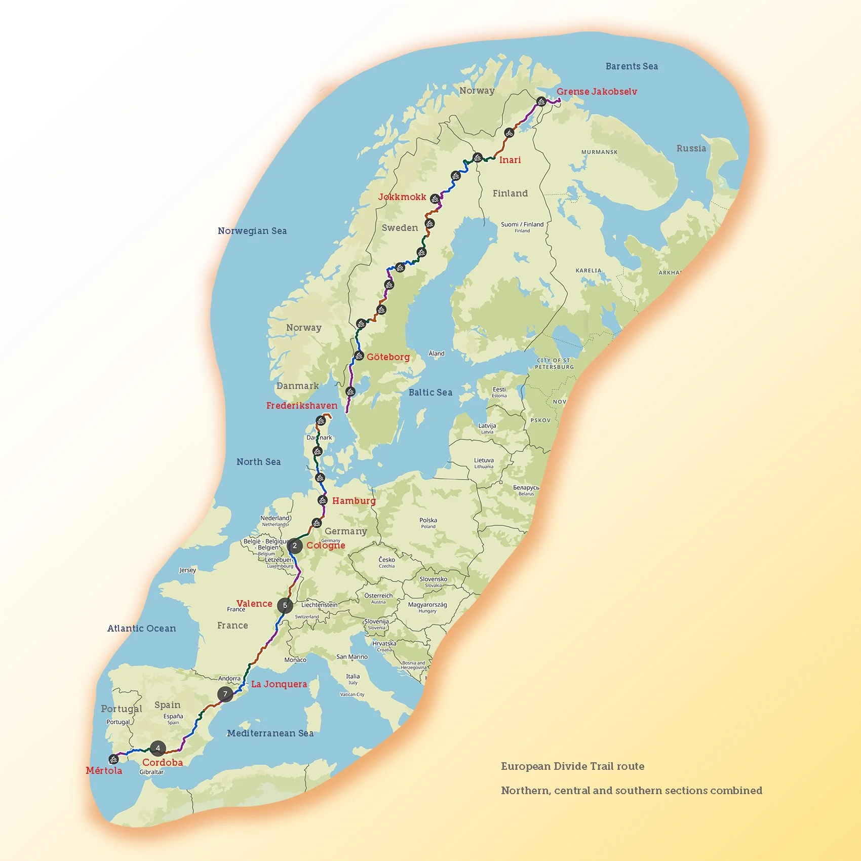 Northern section. The ride starts in Grense Jakobselv in the very North East of Norway, right on the Russian border. From there we will ride in a gentle diagonal South Westerly direction through Finland, followed by a long ride through Sweden where we will finish in Göteborg.