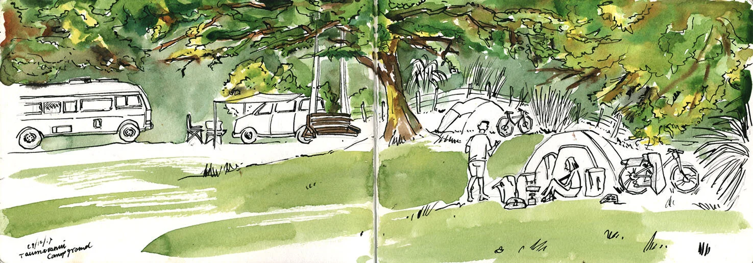 29 December 2017/Meeting other bike riders at the Taramunui campground//Pen & ink, watercolour//